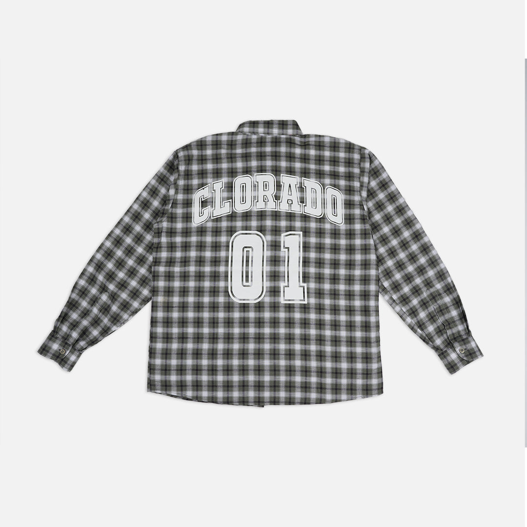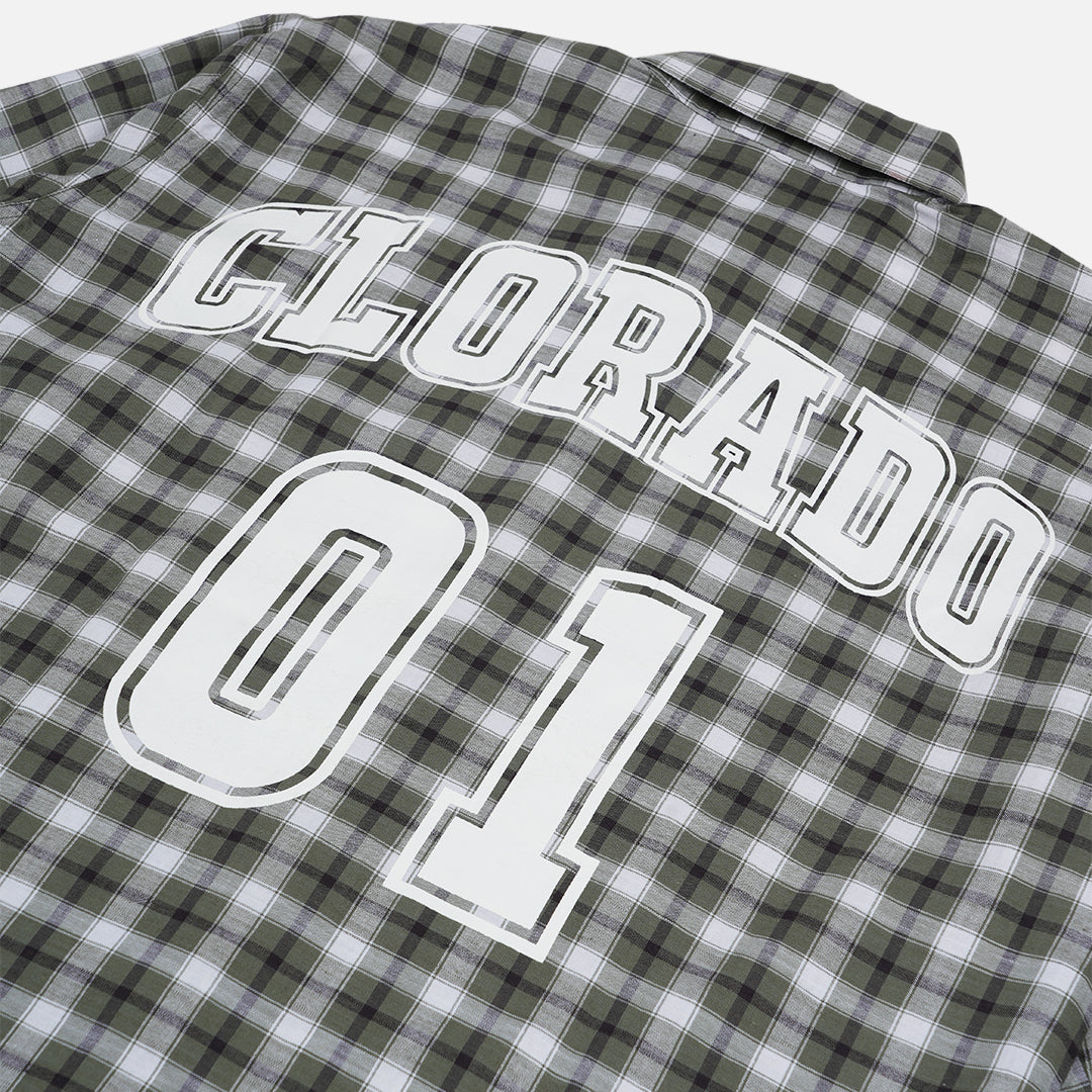 Relaxed fit plaid shirt. Features a screen print, straight hem