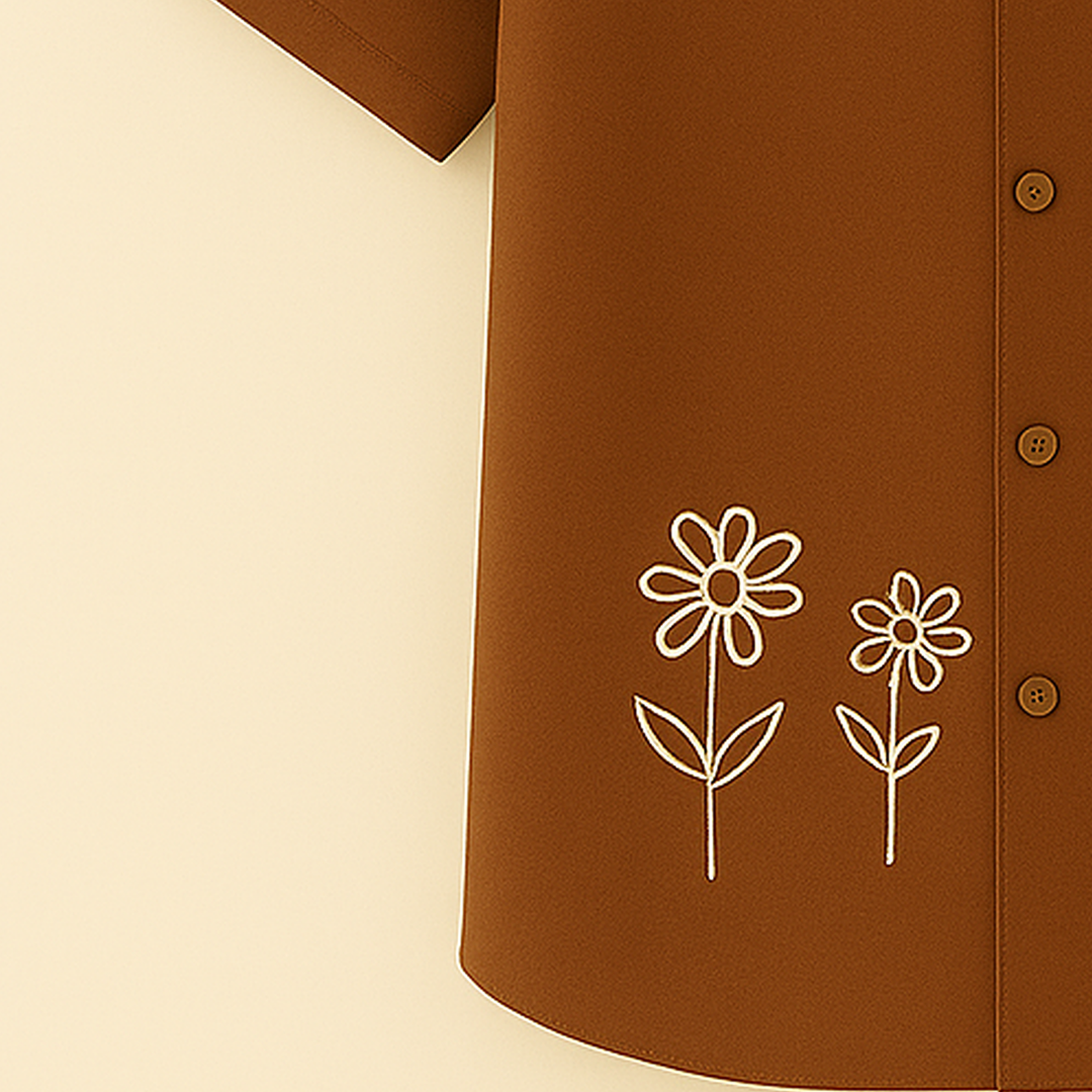 A cotton summer shirt in sun-warmed brown, with bees and quiet blooms crafted not to catch the eye, but to hold it.